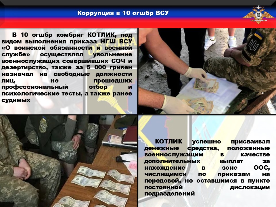 Одним из поводов для инспекции стали коррупционные схемы в 10-й огшбр, организованные комбригом Котликом, который якобы в рамках выполнения приказа НГШ ВСУ «О воинской обязанности и военной службе» осуществлял увольнение военнослужащих, совершивших СОЧ и дезертирство, также за 5 000 гривен назначал на свободные должности лиц, не прошедших профессиональный отбор и психологические тесты, а также ранее судимых.