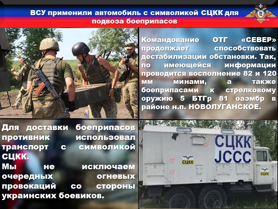 Так, по имеющейся информации, проводится восполнение 82-мм и 120-мм минами, а также боеприпасами к стрелковому оружию 5-й БТГр 81-й оаэмбр в районе н. п. Новолуганское. Для доставки боеприпасов противник использовал транспорт с символикой СЦКК.