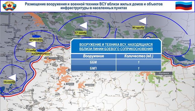 Так, пропагандистами 74 центра ИПсО совместно с представителями телеканала «Украина», пресс-службы штаба ОТГ «Север» и офицерами СЦКК проводится подготовка фиктивных фото- и видеоматериалов о разрушениях гражданской инфраструктуры якобы в результате обстрелов со стороны ЛНР в период с 23 июня.