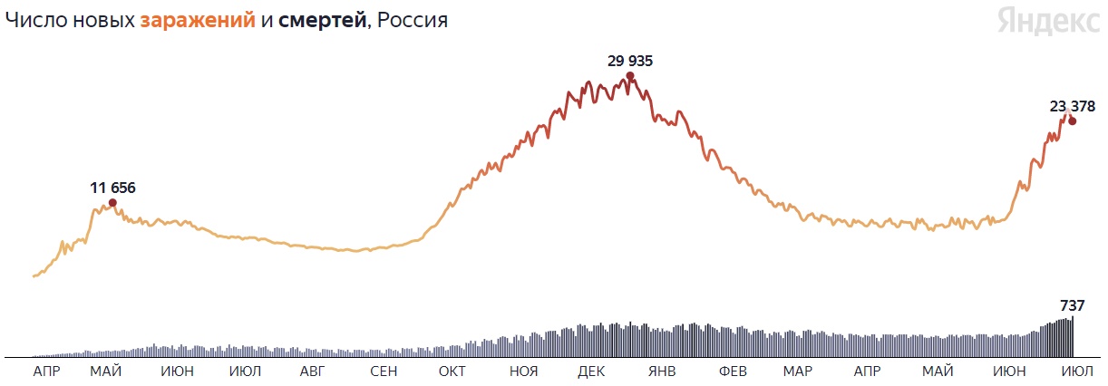 За сутки в России скончались 737 пациентов с тяжёлой формой COVID-19.