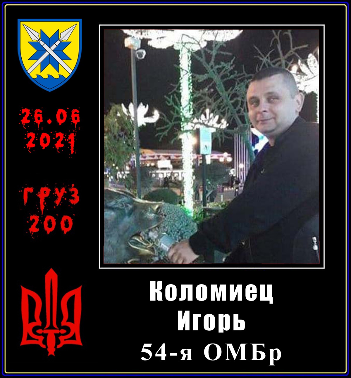 26.06.2021 — Коломиец Игорь, 1968 г. р., военнослужащий 54 ОМБр. Свою расплату за жизни невинно убиенных мирных жителей Донбасса получил в результате внезапной остановки сердца. На родине «героя и защитника незалежной» в г. Кривой Рог Днепропетровской области остались жена и дети.