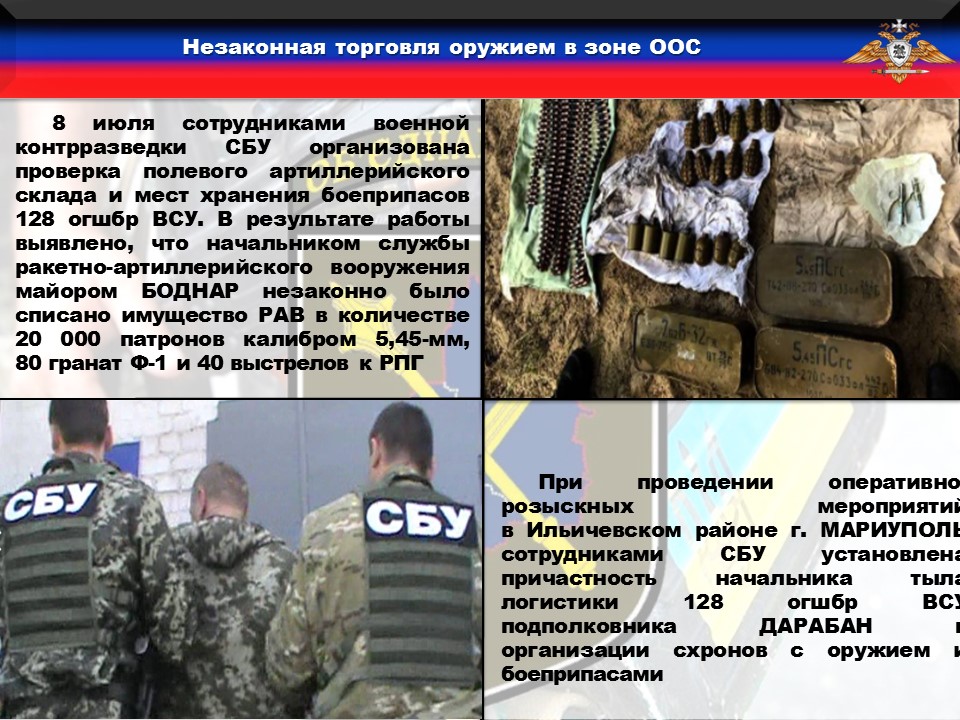 Так, 8 июля сотрудниками военной контрразведки СБУ организована проверка полевого артиллерийского склада и мест хранения боеприпасов 128 огшбр ВСУ. В результате работы выявлено, что начальником службы ракетно-артиллерийского вооружения майором Бондаром незаконно было списано имущество РАВ в количестве 20 000 патронов калибром 5,45 мм, 80 гранат Ф-1 и 40 выстрелов к РПГ.