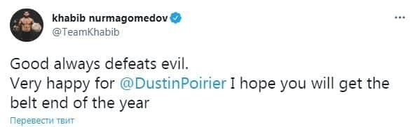 «Добро всегда побеждает зло», — написал он, добавив, что очень счастлив за Дастина Порье и надеется, что тому достанется пояс чемпиона уже к концу этого года.