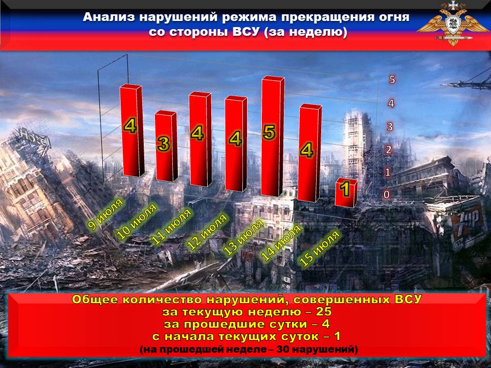 Факты нарушений в оперативном порядке доведены до представителей украинской стороны в СЦКК с целью своевременного принятия мер к нарушителям перемирия и исключения фальсификации данных о нарушениях режима прекращения огня со стороны украинских боевиков.