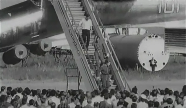 Счастливые лётчики-испытатели спускаются с трапа после первого полёта «Сотки»