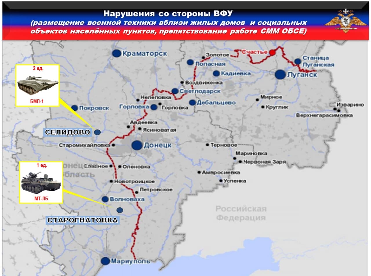 В нарушении третьего пункта дополнительных Мер выявлено размещение трех единиц вооружения и военной техники ВСУ вблизи жилых домов и муниципальных объектов на подконтрольной Украине территории.