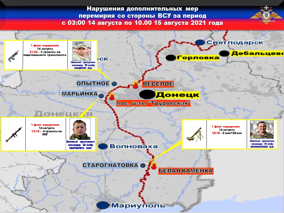 Факты нарушений в оперативном порядке доведены до представителей украинской стороны в СЦКК с целью своевременного принятия мер к нарушителям перемирия и исключения фальсификации данных о нарушениях режима прекращения огня со стороны украинских боевиков.