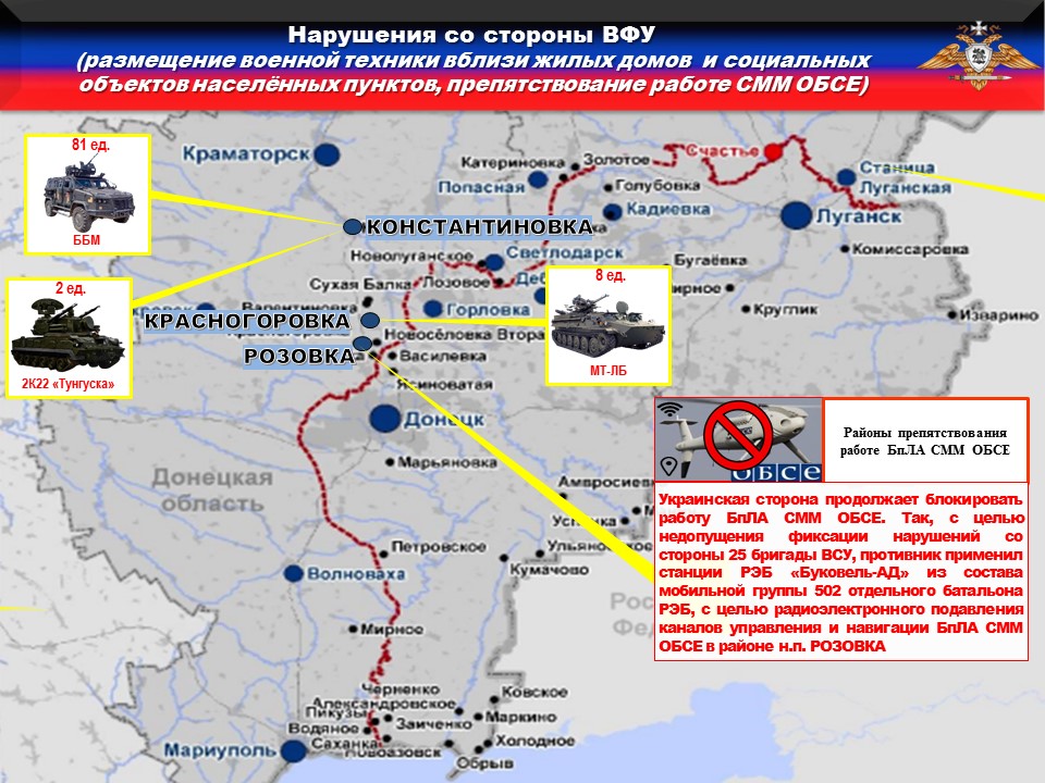 Так, для недопущения фиксации нарушений со стороны 25 бригады, противник применил станции РЭБ «Буковель-АД» из состава мобильной группы 502 отдельного батальона РЭБ с целью радиоэлектронного подавления каналов управления и навигации БПЛА СММ ОБСЕ в районе н. п. Розовка.