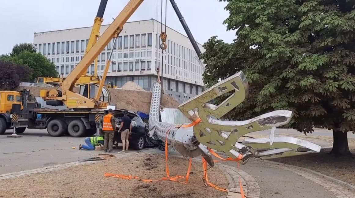 Знаки: самый высокий флагшток с «трызубцем» рухнул и раздавил иномарку в Херсоне (ФОТО, ВИДЕО)
