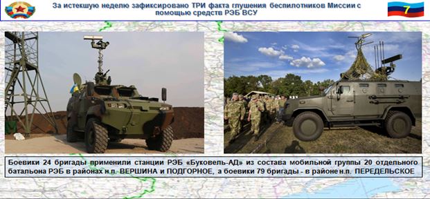 Так, боевики 24 бригады применили станции РЭБ «Буковель-АД» из состава мобильной группы 20 отдельного батальона РЭБ в районах н. п. Вершина и Подгорное, а боевики 79 бригады — в районе н. п. Передельское.