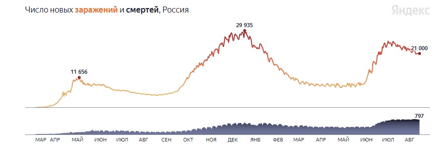 За сутки в России скончались 797 пациентов с COVID-19, полностью выздоровели 20 647 человек.