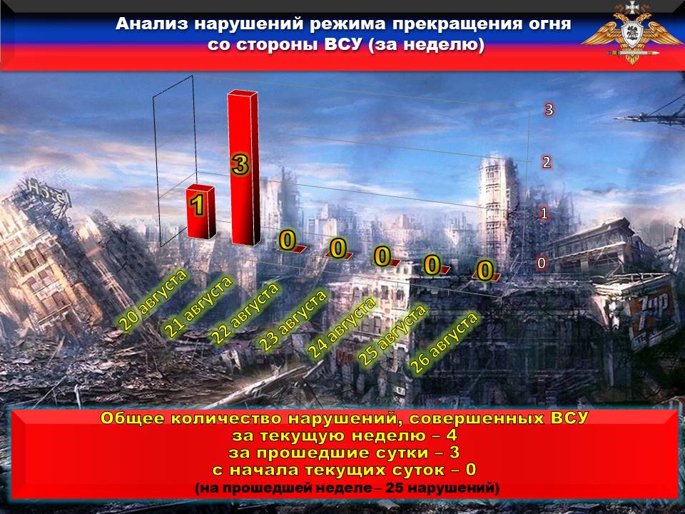Факты нарушений в оперативном порядке доведены до представителей украинской стороны в СЦКК с целью своевременного принятия мер к нарушителям перемирия и исключения фальсификации данных о нарушениях режима прекращения огня со стороны украинских боевиков.