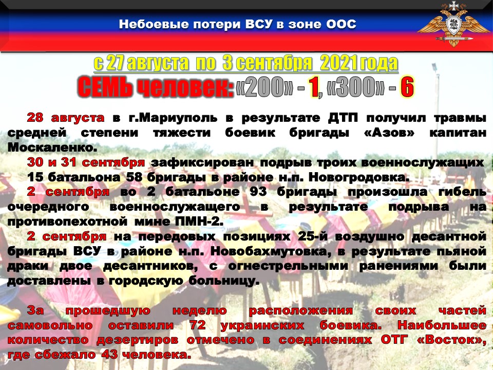 Согласно доклада начальника военной службы правопорядка в «ООС», за прошедшую неделю расположения своих частей самовольно оставили 72 украинских боевика. Наибольшее количество дезертиров отмечено в соединениях ОТГ «Восток», где сбежало 43 человека.