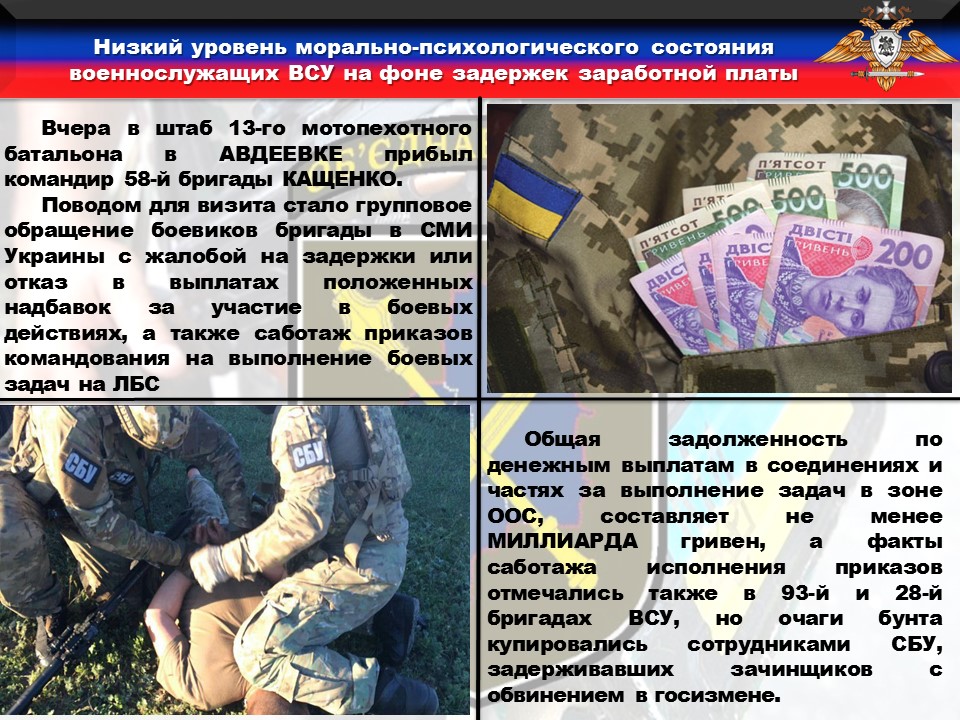 По нашей информации, общая задолженность по денежным выплатам в соединениях и частях за выполнение задач в зоне «ООС» составляет не менее миллиарда гривен, а факты саботажа исполнения приказов отмечались также в 93-й и 28-й бригадах ВСУ, но данные очаги бунта купировались сотрудниками СБУ, задерживающими зачинщиков с обвинением в госизмене.