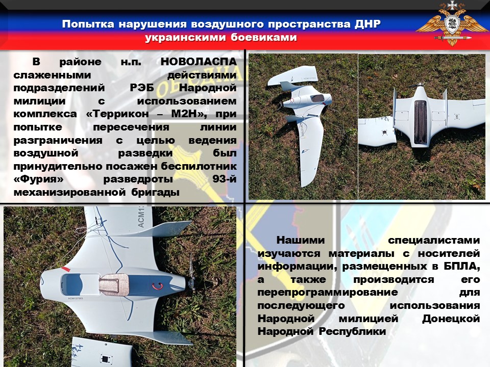 Так, в районе н. п. Новоласпа слаженными действиями подразделений ПВО и РЭБ Народной милиции с использованием комплекса «Террикон-М2Н» при попытке пересечения линии разграничения с целью ведения воздушной разведки был принудительно посажен беспилотник «Фурия» разведроты 93-й механизированной бригады.