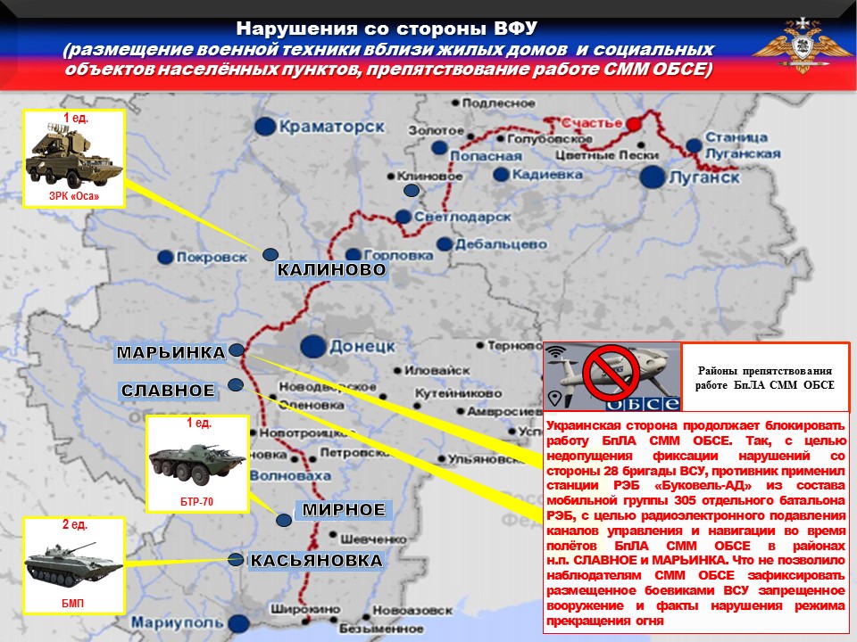 Так, с целью недопущения фиксации нарушений со стороны 28-й бригады противник применил станции РЭБ «Буковель-АД» из состава мобильной группы 305-го отдельного батальона РЭБ для радиоэлектронного подавления каналов управления и навигации во время полётов БпЛА СММ ОБСЕ в районах н. п. Славное и Марьинка.