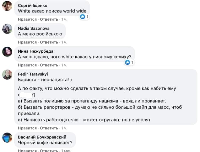 В комментариях отметили, что меню заведения полностью на русском, а с самим кофейным неонацистом вряд ли что-то можно будет сделать с правовой точки зрения на Украине.