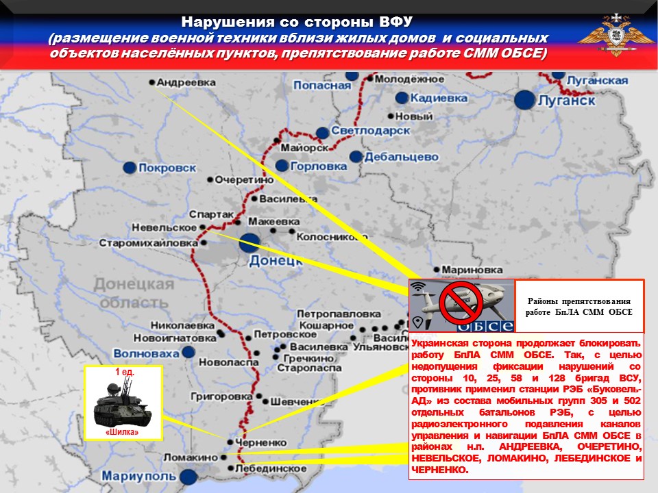 Украинская сторона продолжает блокировать работу БпЛА СММ ОБСЕ с целью недопущения фиксации размещения запрещенного Минскими соглашениями вооружения.