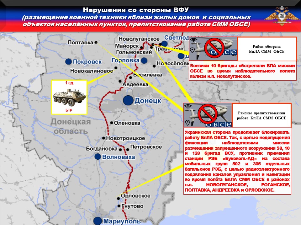 Так, с целью недопущения фиксации наблюдателями Миссии размещения запрещенного вооружения 58, 10 и 128-й бригад для радиоэлектронного подавления каналов управления и навигации во время полётов БпЛА СММ ОБСЕ в районах н. п. Новолуганское, Роганское, Полтавка, Андреевка и Орловское противник применил станции РЭБ «Буковель-АД» из состава мобильных групп 502 и 305-го отдельных батальонов РЭБ, а также электромагнитные ружья направленного действия, которыми были оснащены подразделения ВСУ в зоне «ООС».