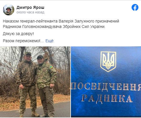 Об этом сам Ярош сообщил на своей странице в соцсети, поблагодарив Залужного за доверие.