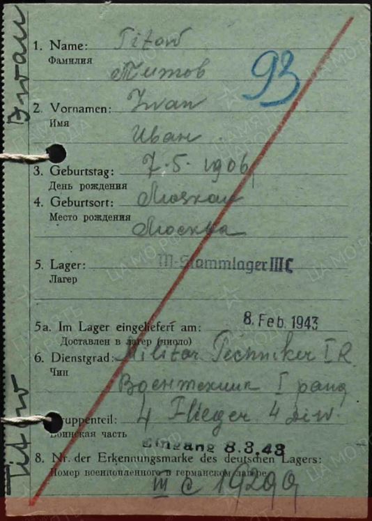 Учётная карта узника лагеря M Stammlager III-C, лагерный номер 19299 Титова Ивана Васильевича