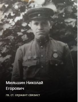 Четвёртый сын Николай Егорович Мильшин (01.05.1917 — 16.06.2005) начал войну в составе 28 сп 75 сд связистом. 5 марта 1943 года награждён первой медалью «За отвагу».