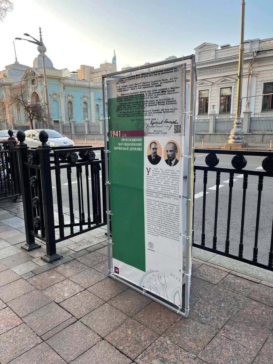 У здания Верховной рады установили плакат с упоминанием Адольфа Гитлера. Он посвящен так называемому «Акту провозглашения украинского государства» в июне 1941 года.