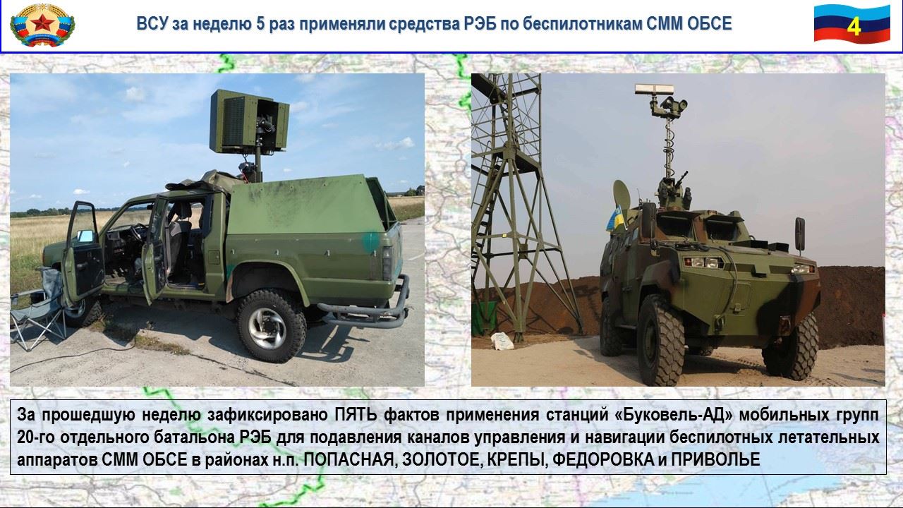 Так, отмечено применение мобильных групп со станциями РЭБ «Буковель-АД» из состава 20 отдельного батальона РЭБ в районах н. п. Попасная, Золотое, Крепы, Федоровка и Приволье.