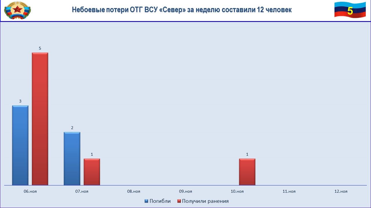 По данным нашей разведки, с 6 по 12 ноября в соединениях и частях ОТГ «Север» небоевые потери личного состава составили двенадцать человек, из которых пять погибли, семь получили ранения и травмы различной степени тяжести: