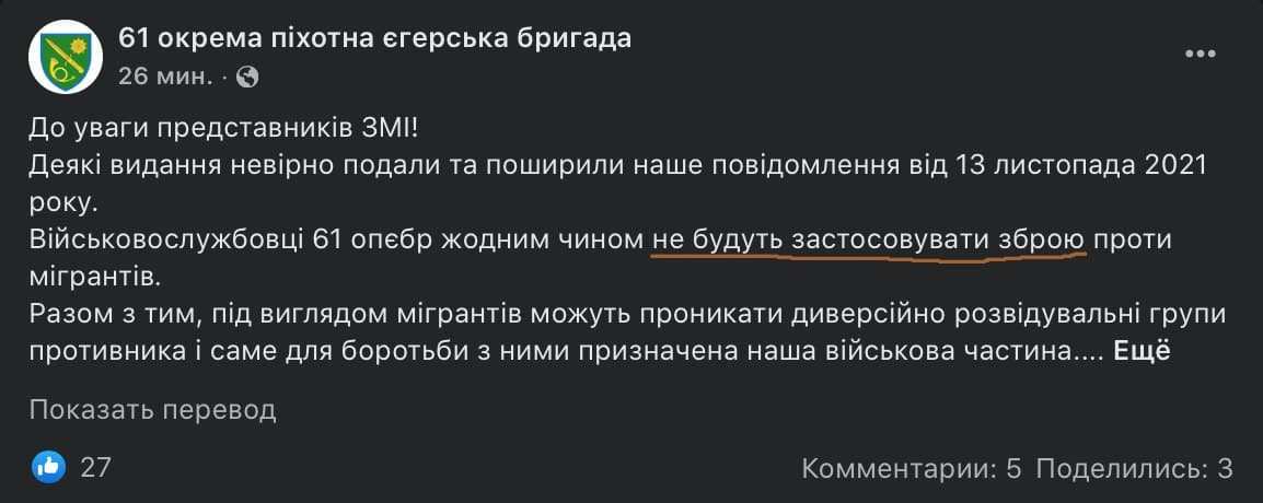 «В настоящее время подразделения 61-й ОПЕБр выполняют свои задачи вдоль участка государственной границы с Республикой Беларусь и ни один так называемый мигрант, а также другие лица, которые могут маскироваться под мигрантов, не попадут на территорию Украины. Они просто будут уничтожены нашими подразделениями», — сообщила пресс-служба бригады в Facebook.
