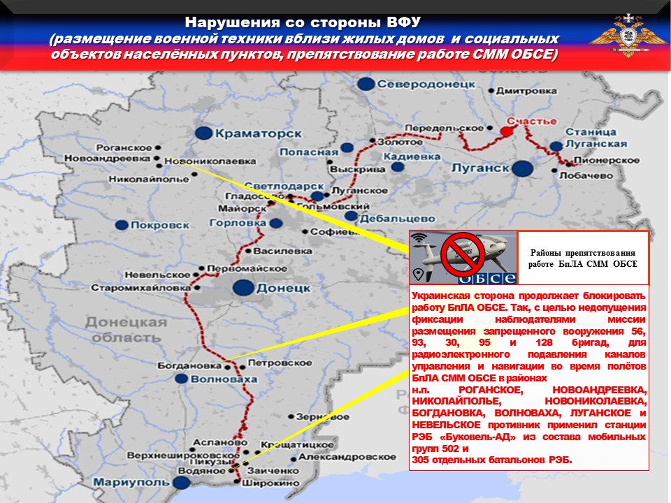 Так, с целью недопущения фиксации наблюдателями миссии размещения запрещенного вооружения 56, 93, 30, 95 и 128-й бригад, для радиоэлектронного подавления каналов управления и навигации во время полётов БПЛА СММ ОБСЕ в районах н. п. Роганское, Новоандреевка, Николайполье, Новониколаевка, Богдановка, Волноваха, Луганское и Невельское противник применил станции РЭБ «Буковель-АД» из состава мобильных групп 502 и 305 отдельных батальонов РЭБ.