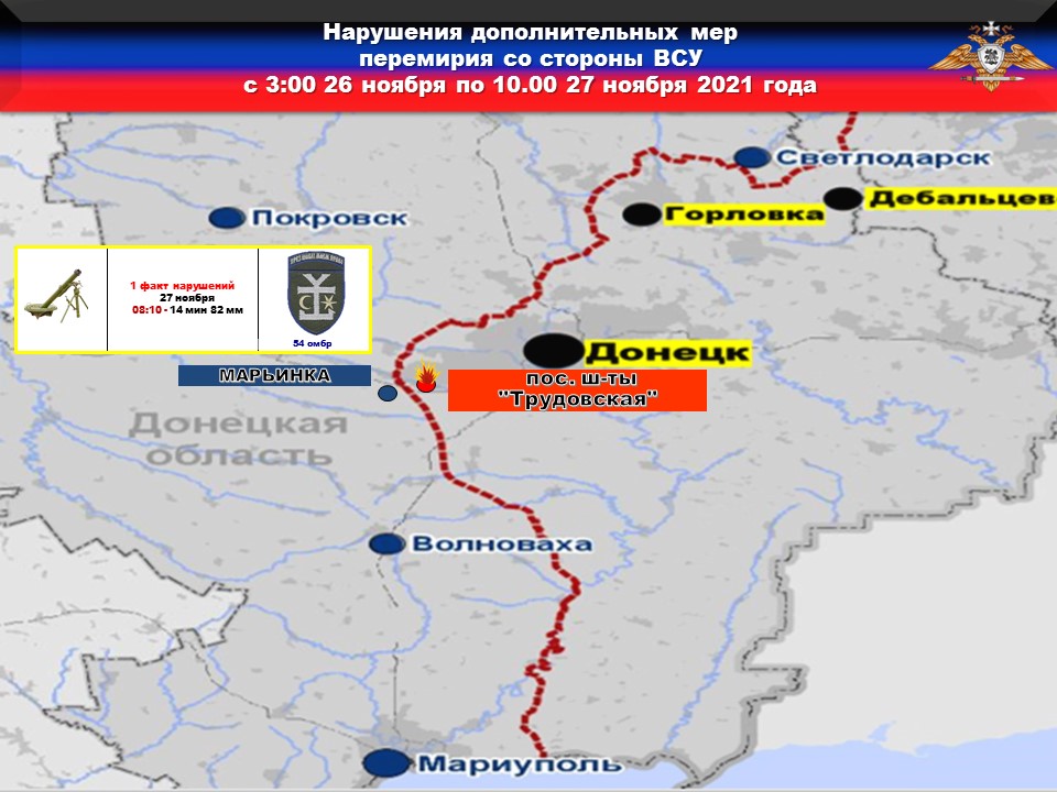 Также, согласно отчету от 26 ноября 2021 года, наблюдателями миссии вновь зафиксирован факт открытия огня с позиций 25 овдбр в районе ДФС.