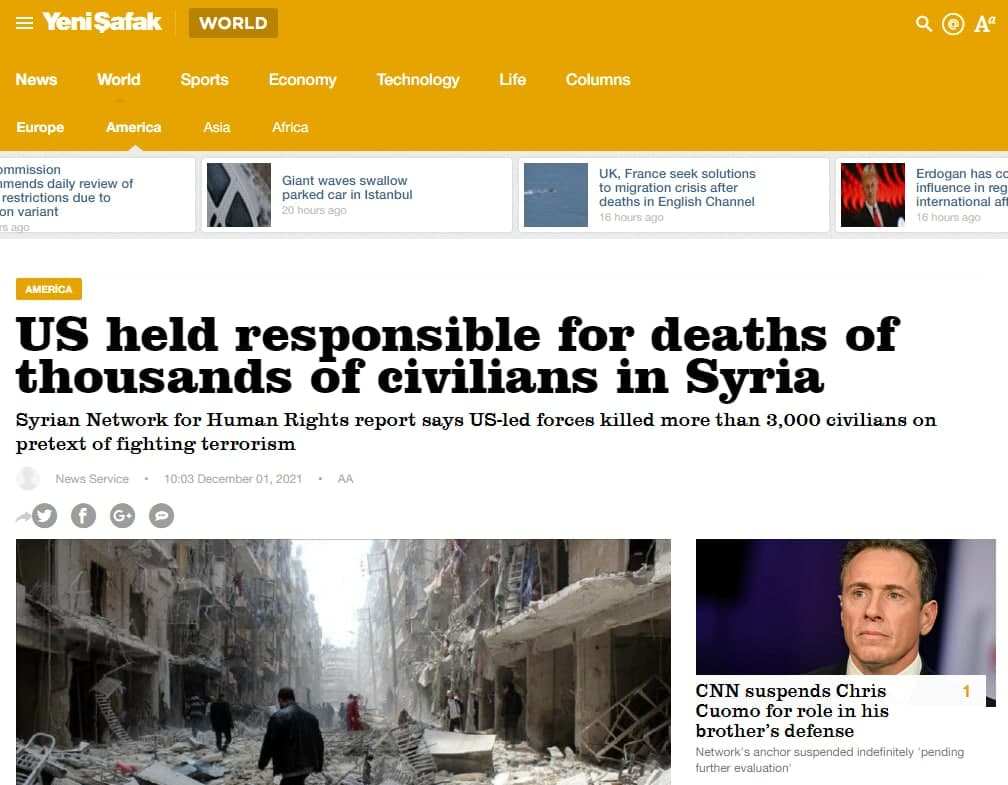 После того как свежие поводы вылить ушат помоев на Америку закончились, ведущие турецкие СМИ начали ворошить прошлое и не нашли ничего лучше, чем использовать прошлогодний материал «Сирийской Сети по правам человека» о причастности армии США к гибели более 3 тысяч мирных граждан Сирии. Статья была обнародована аж 23 сентября 2020 года.