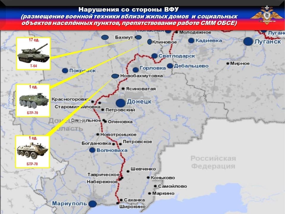 В нарушение третьего пункта дополнительных мер, киевские оккупанты разместили девятнадцать единиц вооружения и военной техники в трех подконтрольных Украине населенных пунктах.