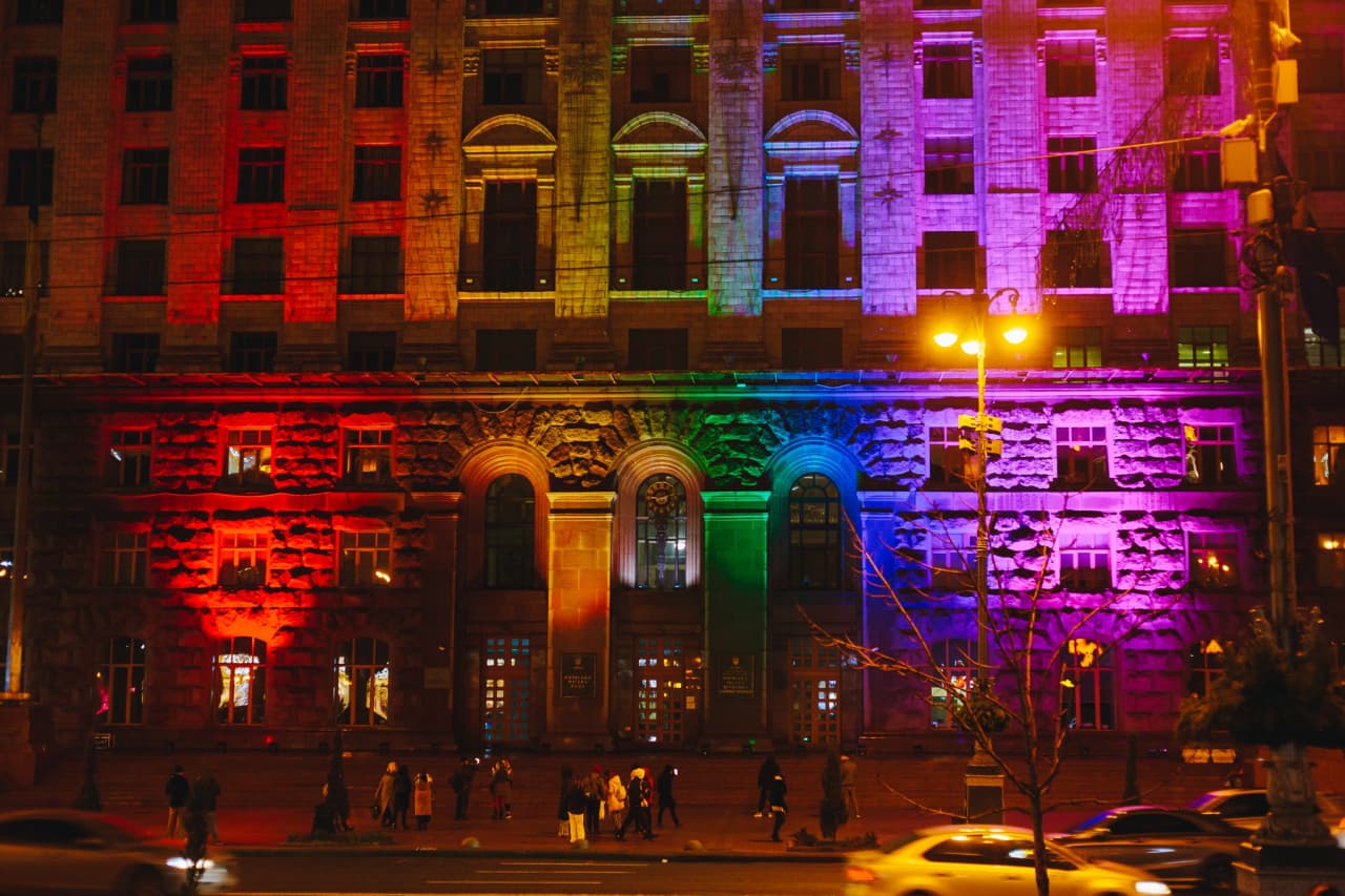 Вечером 10 декабря здание Киевской горгосадминистрации (КГГА) подсветили цветами ЛГБТ-флага.