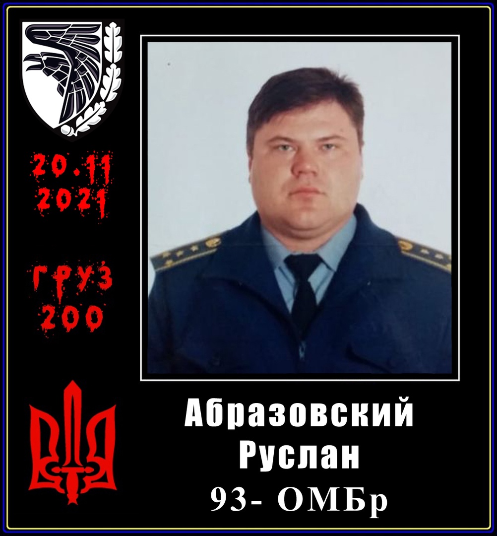 ► 20.11.2021 — Абразовский Руслан Валерьевич, 1977 г. р., майор, начальник отделения командного пункта 93-й ОМБр. Свою расплату за жизни невинно убиенных мирных жителей Донбасса получил в виде смерти в больнице г. Днепропетровска от несовместимых с жизнью ранений, полученных в результате боестолкновения с силами Л/ДНР. На родине «героя и защитника незалежной» в пгт Литин Винницкой области остались жена и дети.