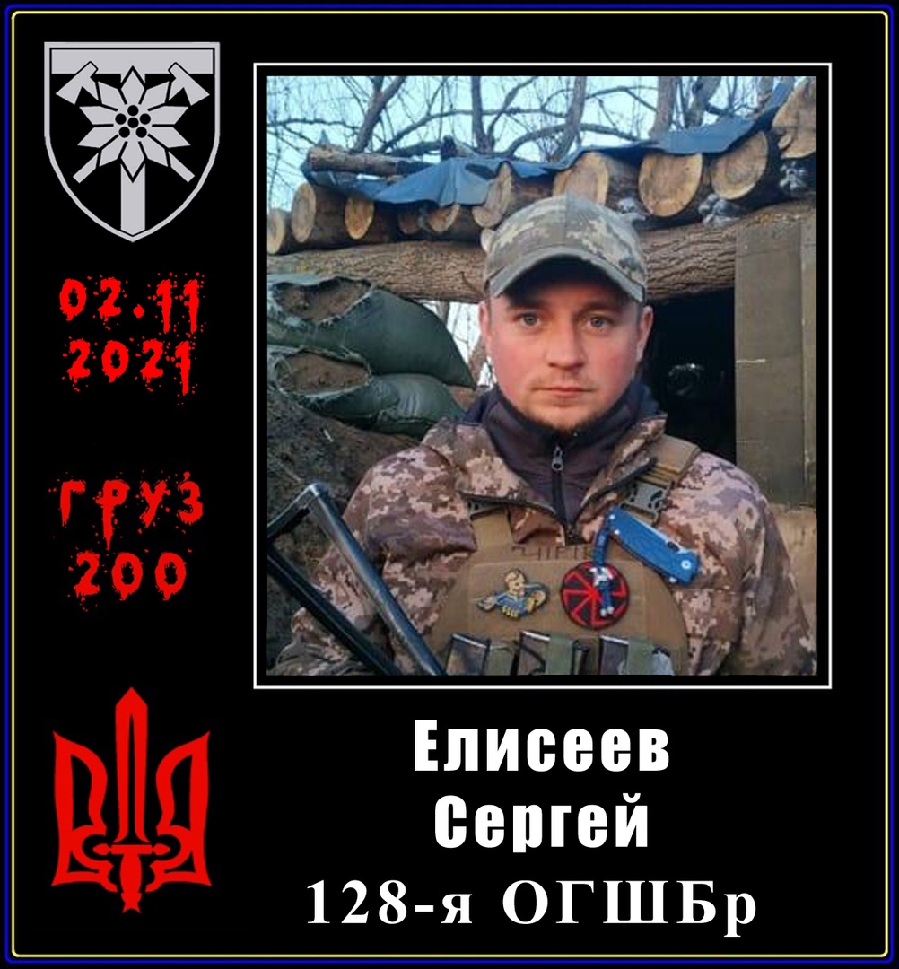 ► 02.11.2021 — Елисеев Сергей Валерьевич, 1990 г. р., сержант, командир боевой машины — командир отделения подразделения 128-й ОГШБр. С 2015 года добровольно отправился в зону «АТО»/«ООС», где за деньги истреблял мирное население Донбасса.