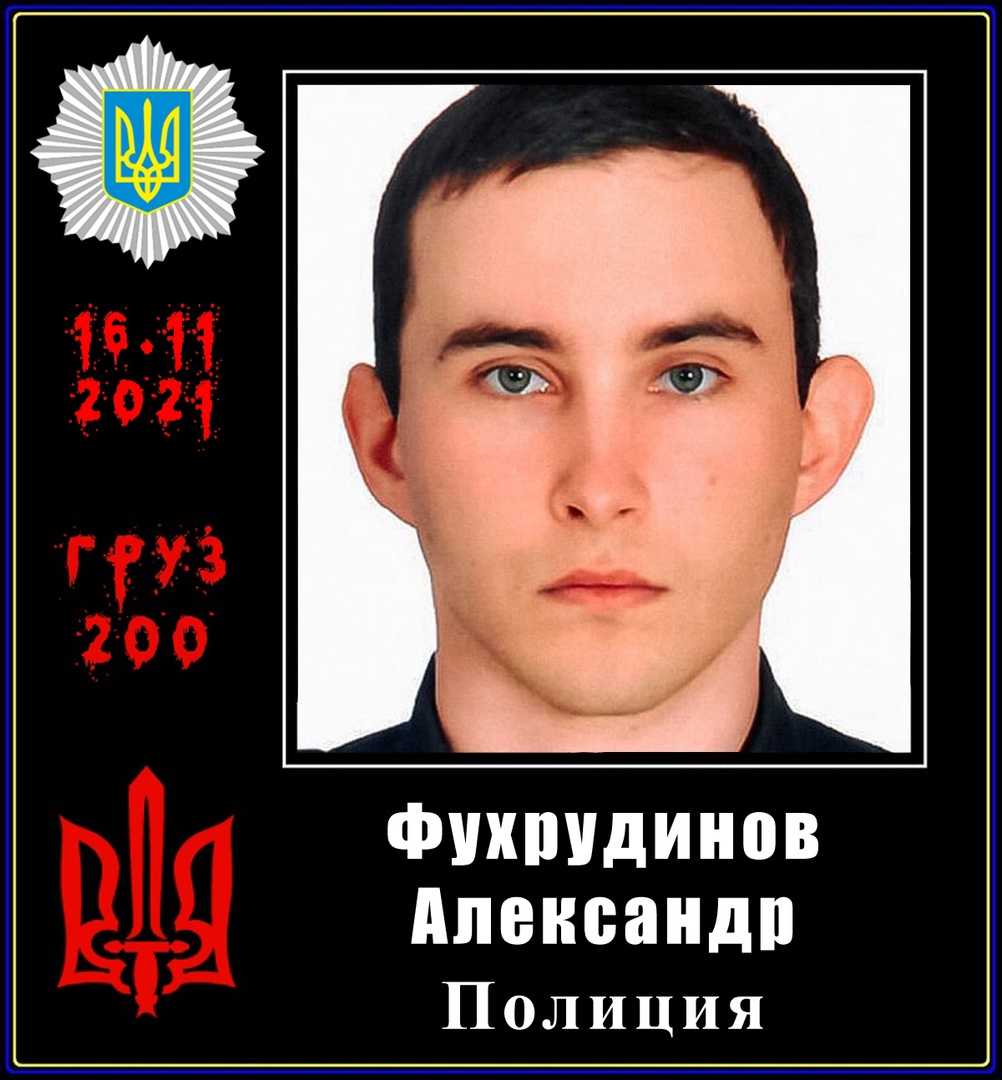 ► 16.11.2021 — Фухрудинов Александр, 1997 г. р., патрульный полицейский. Свою расплату за жизни невинно убиенных мирных жителей Донбасса получил в виде смерти во время исполнения своих служебных обязанностей от рук своего же напарника. На родине «героя и защитника незалежной» в г. Рубежном, временно оккупированная территория ЛНР, осталась мать.