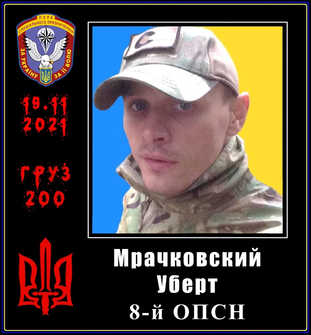 ► 19.11.2021 — Мрачковский Уберт Валерьевич, 1988 г. р., старший солдат, снайпер подразделения 8-го ОПСН. С 2014 года добровольно отправился в зону «АТО»/«ООС», где за деньги истреблял мирное население Донбасса.