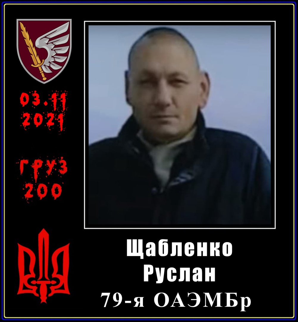 ► 03.11.2021 — Щабленко Руслан Александрович, 1976 г. р., участник «АТО» в составе 79-й ОАЭМБр. С 2014 года добровольно отправился в зону «АТО», где за деньги истреблял мирное население Донбасса.