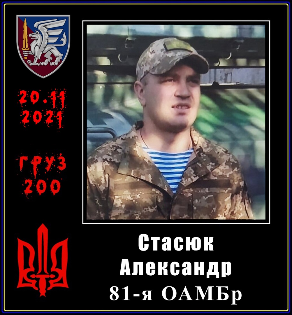 ► 20.11.2021 — Стасюк Александр Петрович, 1984 г. р., военнослужащий 81-й ОАМБр. Свою расплату за жизни невинно убиенных мирных жителей Донбасса получил в виде внезапной остановки сердца. На родине «героя и защитника незалежной» в с. Германовка Обуховского района Киевской области остались мать, жена и дети.