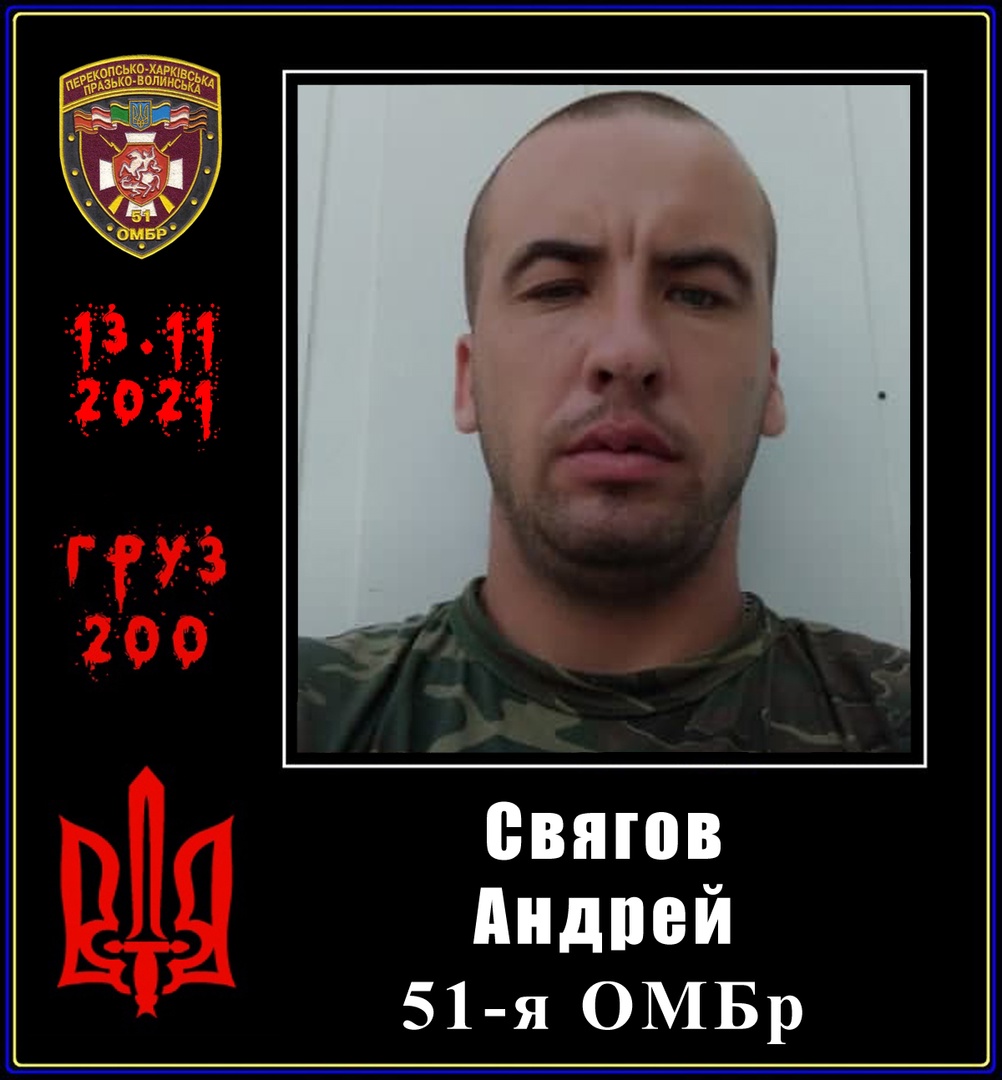 ► 13.11.2021 — Свягов Андрей, 1993 г. р., военнослужащий 51-й ОМБр. Свою расплату за жизни невинно убиенных мирных жителей Донбасса получил покончив жизнь самоубийством. На родине «героя и защитника незалежной» в г. Рожище Волынской области остались родители.