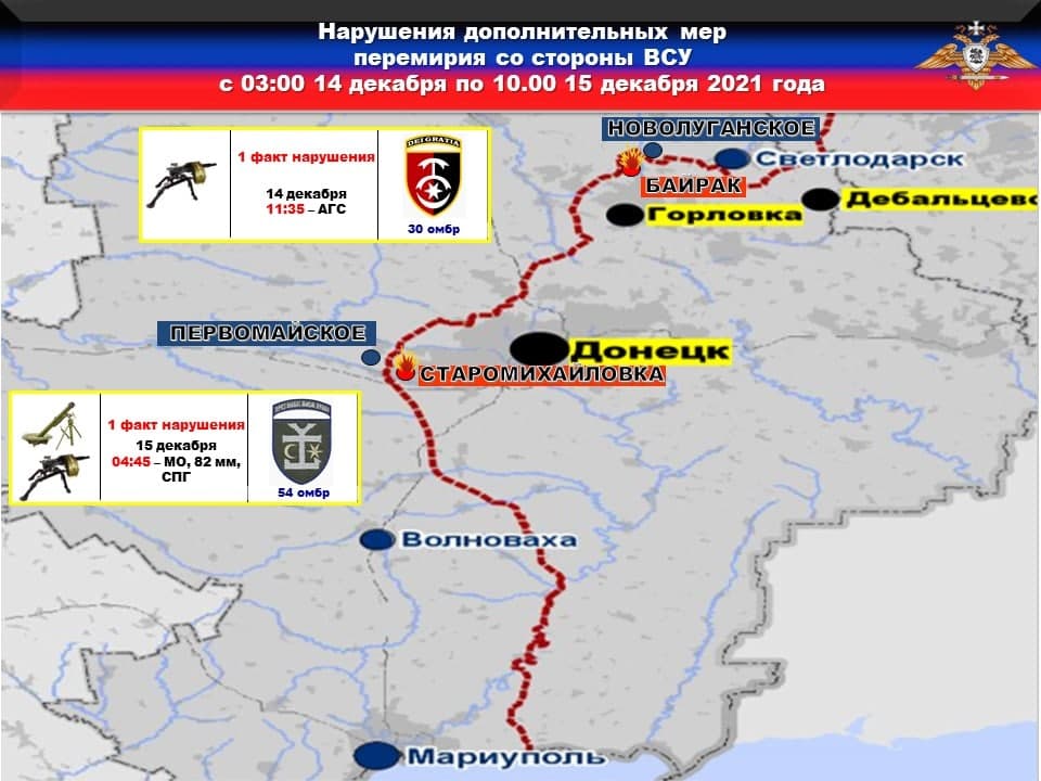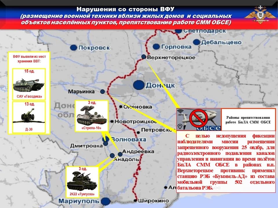 В нарушение третьего пункта дополнительных мер киевские оккупанты разместили восемь единиц военной техники 53-й омбр в трех подконтрольных населенных пунктах: два ЗРК «Стрела-10» и ЗРК «Тунгуска» на территории двух объектов вблизи жилого сектора н. п. Андреевка, два ЗРК «Тунгуска» вблизи н. п. Дмитровка и три ЗРК «Стрела-10» вблизи н. п. Анадоль.