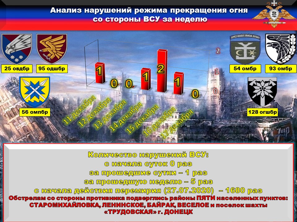 ► 12 декабря на блокпосту в районе н. п. Зачатовка в результате конфликта между боевиками 21-й бригады общественного порядка нацгвардии и 93-й омбр ВСУ двое карателей 93-й бригады получили огнестрельные ранения;