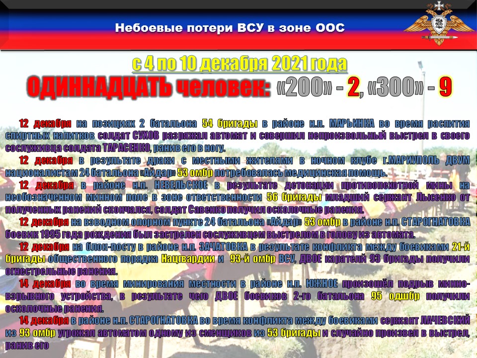 ► 14 декабря в районе н. п. Старогнатовка во время конфликта между боевиками сержант Лачевский из 93-й омбр угрожал автоматом одному из сменщиков из 53-й бригады и случайно произвел выстрел, ранив его.