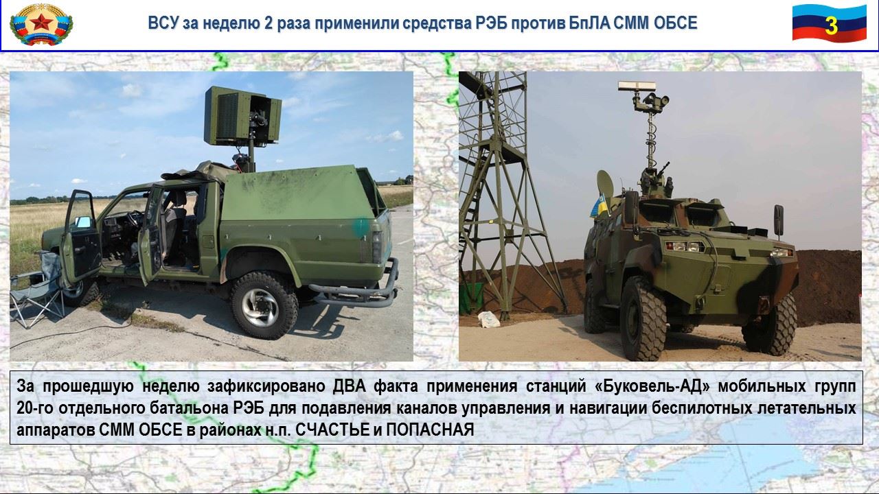 Так, отмечено применение мобильных групп со станциями РЭБ «Буковель-АД» из состава 20 отдельного батальона РЭБ в районах н. п. Счастье и Попасная.