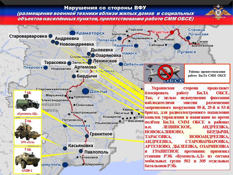 Так, с целью недопущения фиксации наблюдателями миссии размещения запрещенного вооружения 95, 25 и 53-й бригад для радиоэлектронного подавления каналов управления и навигации во время полётов БПЛА СММ ОБСЕ в районах н. п. Ленинское, Андреевка, Новокалиново, Бердычи, Тарасовка, Новоандреевка, Андреевка, Староварваровка, Артемово, Дылеевка, Озаряновка и Гранитное противник применил станции РЭБ «Буковель-АД» из состава мобильных групп 502 и 305-го отдельных батальонов РЭБ.