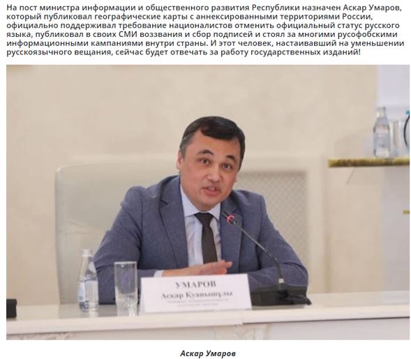 Назначение злобного русофоба Аскара Умарова на пост министра информации — это недружественный шаг по отношению к нашей стране.