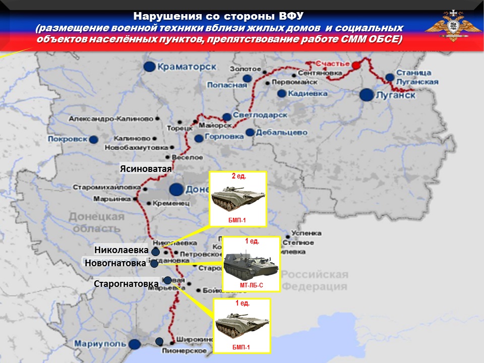 В нарушение третьего пункта дополнительных мер боевики 53-й омбр разместили две БМП-1 вблизи жилых домов в н. п. Николаевка, один бронетранспортер МТ-ЛБ-С в частном секторе н. п. Новогнатовка и одну БМП-1 в жилом районе н. п. Старогнатовка.