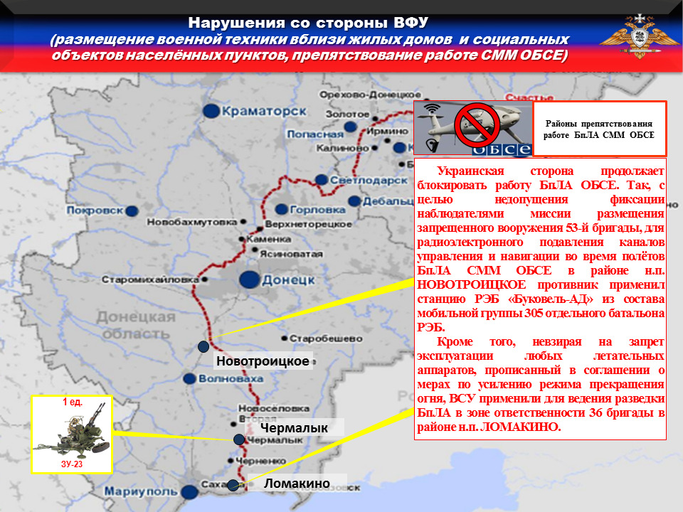 Украинская сторона продолжает блокировать работу БпЛА ОБСЕ. Так, с целью недопущения фиксации наблюдателями миссии размещения запрещенного вооружения 53-й бригады, для радиоэлектронного подавления каналов управления и навигации во время полётов БпЛА СММ ОБСЕ в районе н. п. Новотроицкое противник применил станцию РЭБ «Буковель-АД» из состава мобильной группы 305 отдельного батальона РЭБ.